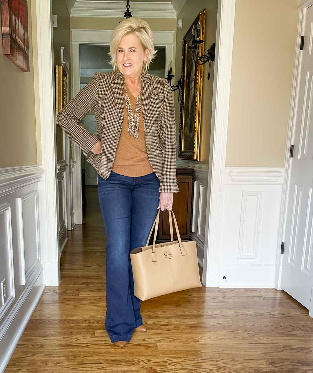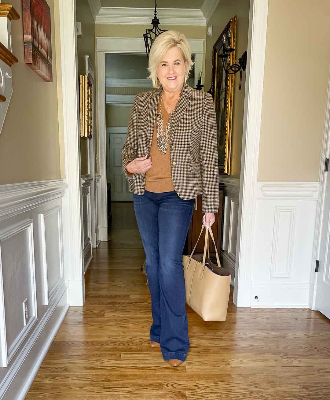 I think the schoolboy houndstooth blazer pulls the look together in a very polished way. The outfit is casual but very polished and sophisticated-looking. This is a wool-blend blazer, and it is a classic style that you will be able to wear for years. I sized up so that I could wear the blazer over a sweater, I am wearing a 12, and it fits great.