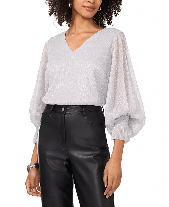 Vince Camuto Metallic V-Neck Sheer-Sleeve Top