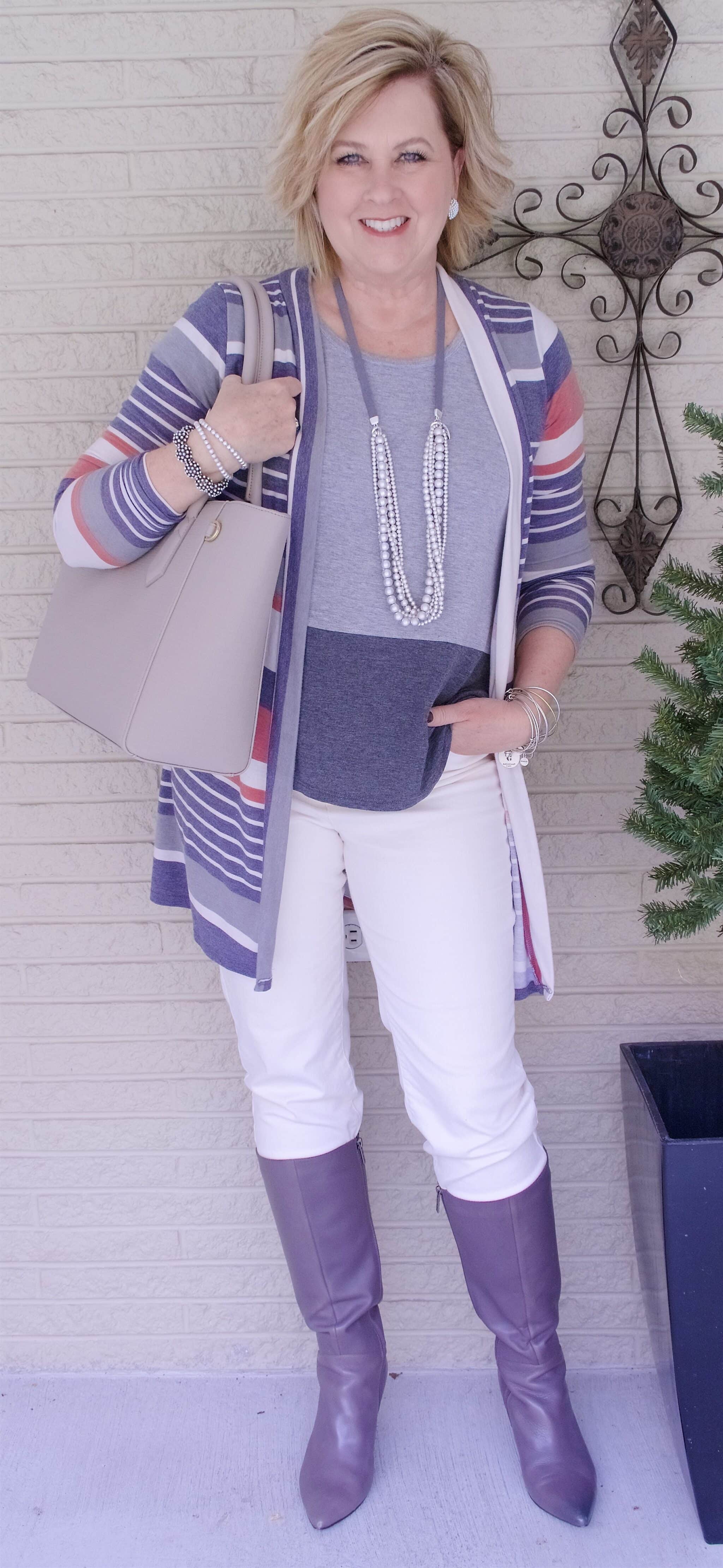 In this photo, my outfit looks like a “hit,” but we will talk about that in a minute. Right now I am only going to talk about the top half of this look. Today is the last outfit of my white, and in this case it is winter white, outfits for the spring series. None of the items in this look are new, they are all recycled items from my closet. The long striped cardigan is one that I bought in the later part of the summer at a local boutique in town. Here is how I wore it last fall. What I liked about this Veveret cardigan was the faded color look. I like how it looks worn and soft instead of so vibrant.
