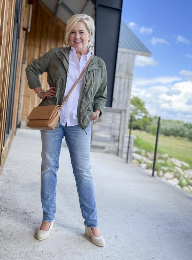 Something is wrong with me! I’ve never liked the color Olive, and this year, I keep buying it. I love the color this year, and that has never happened before. I think this drawstring waist utility jacket is sharp, and I can see myself wearing this a lot this fall. A bunch of you must feel the same way because I put up a selfie on IG wearing this jacket, and I had a ton of people asking where I found it. I am wearing a large, and I think that the jacket runs true to size.
